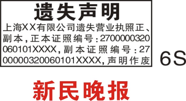 企业遗失声明 - 遗失营业执照正副本6行