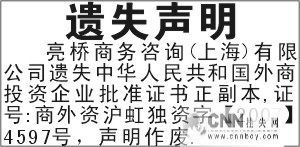 公司遗失中华人民共和国外商